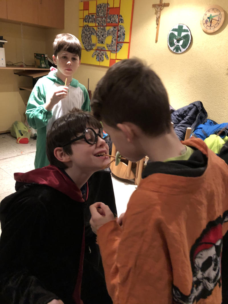 Jungpfadfinder kamen verkleidet und geschminkt. Der Leiter Marcel eröffnete die Faschingsparty mit lauter Musik.