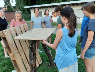 Die drei Sippten bauten eine Wäscheleine, einen Müllereimer und einen Tisch. Die Wäscheleine war zuerst fertig und
